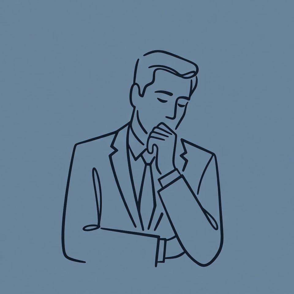 A line drawing illustration of a man in a suit with his hand on his chin in a thoughtful pose. He wears a jacket, shirt, and tie, facing slightly to the side. The image features clean black outlines on a solid blue background.