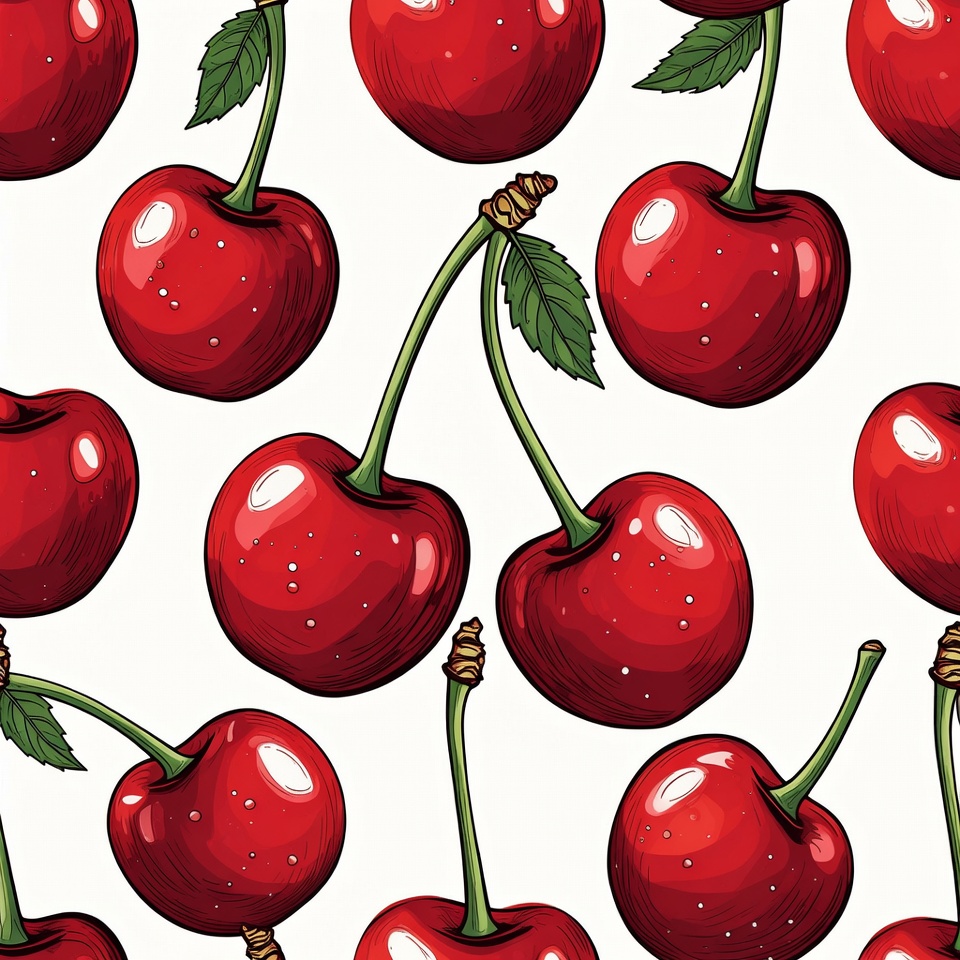 berry pattern, cherry illustration, cherry pattern, cherry stems, clipart, fresh cherries, fruit pattern, glossy cherries, green leaves, illustration, isolated background, red cherries, red fruit, repeating cherries, seamless pattern, summer fruit, vector cherries, white background, cherries