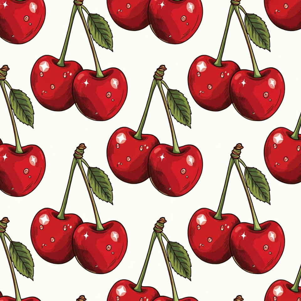 berry pattern, cartoon cherries, cherry clusters, cherry illustration, cherry pattern, cherry wallpaper, clipart, fruit illustration, fruit pattern, green leaves, isolated background, red cherries, red fruit, repeating pattern, seamless pattern, shiny cherries, stems, summer fruit, vector cherries, white background, cherries