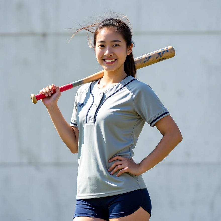 Asian, athlete, baseball bat, baseball jersey, baseball player, confident pose, female, girl, gray uniform, hand on hip, holding bat, navy shorts, outdoor, ponytail, smiling, sports uniform, sportswear, white background, wooden bat, young woman, Asian girl
