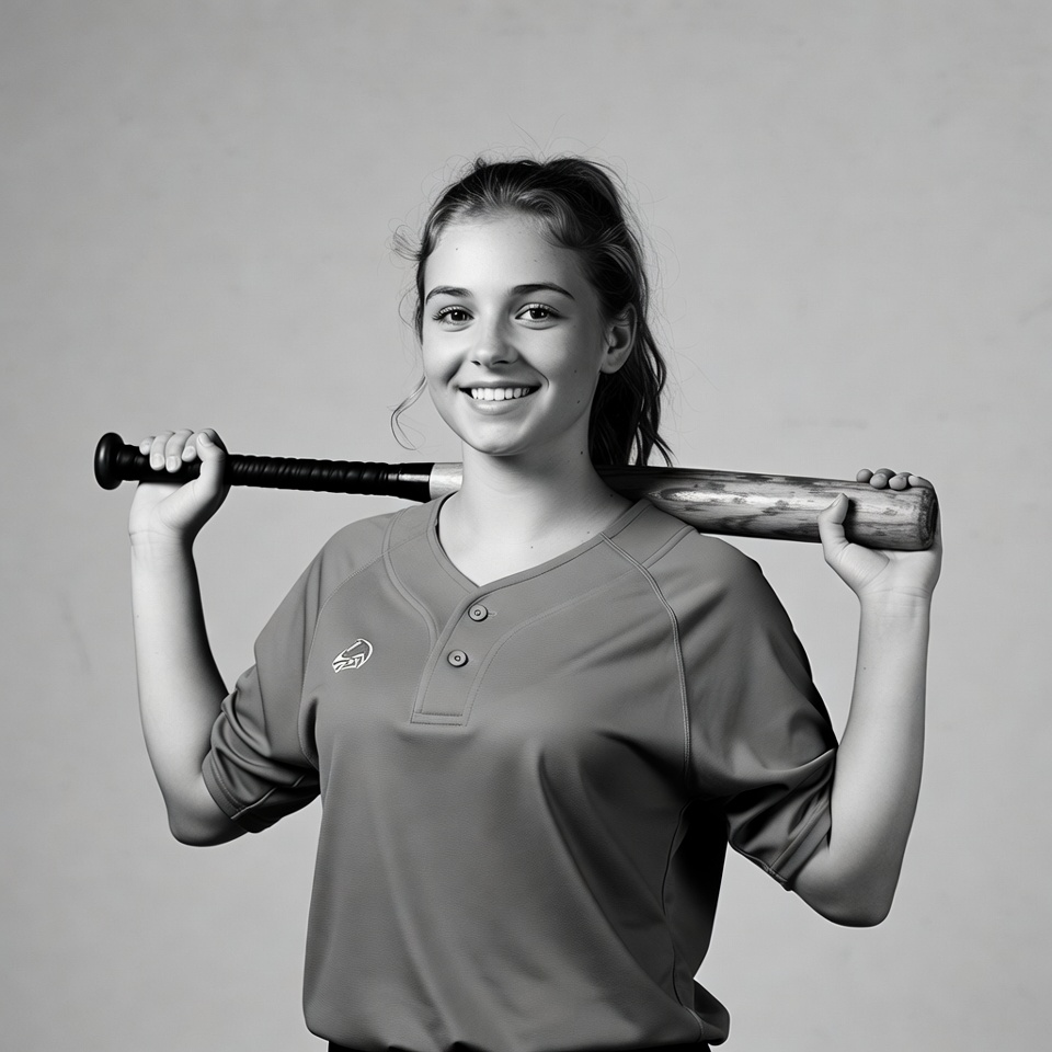 athlete, baseball bat, baseball jersey, baseball player, black and white, female, gray uniform, holding bat, isolated background, monochrome photo, ponytail, portrait, smiling, sports uniform, young girl, girl