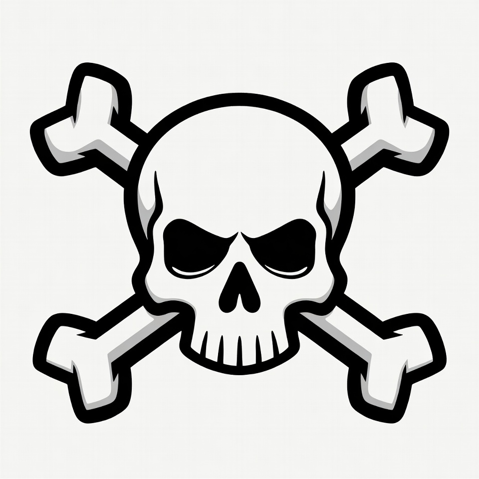 A bold black skull and crossbones illustration features a grinning white skull with dark eye sockets and nasal cavity atop two white crossed bones. The design uses thick black outlines on a transparent background. It has a cartoonish, vector art style.