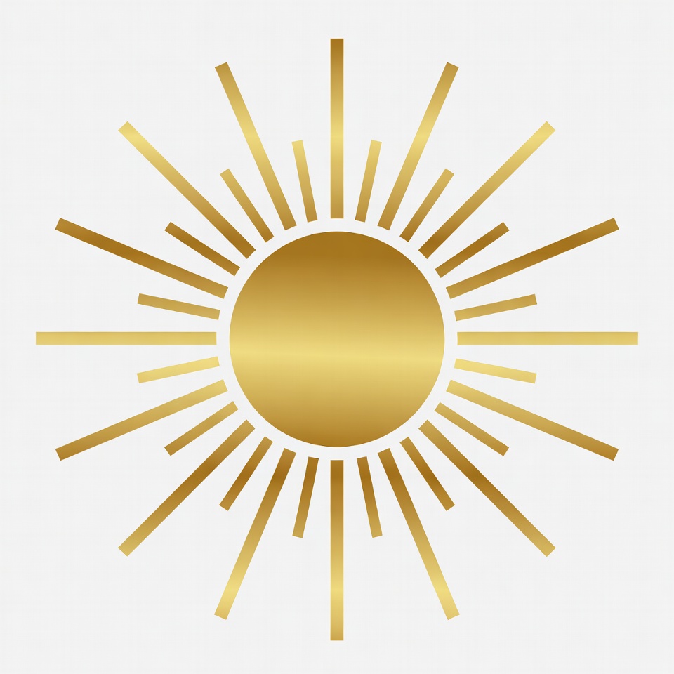 A golden sunburst illustration features a bright yellow-gold circular center with radiating straight rays. The design is simple and bold against a white isolated background. It has a metallic gold appearance suitable for vector graphics.