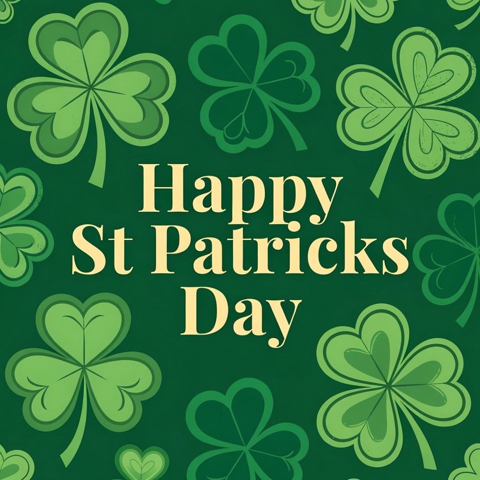 Happy St. Patricks Day, Irish holiday, March 17, Saint Patrick, St Patty's Day, celebratory text, clipart, clovers, digital illustration, emerald green, festive design, four-leaf clovers, green background, green shamrocks, holiday graphic, illustration, leaf pattern, shamrocks, vector art, St. Patrick's Day