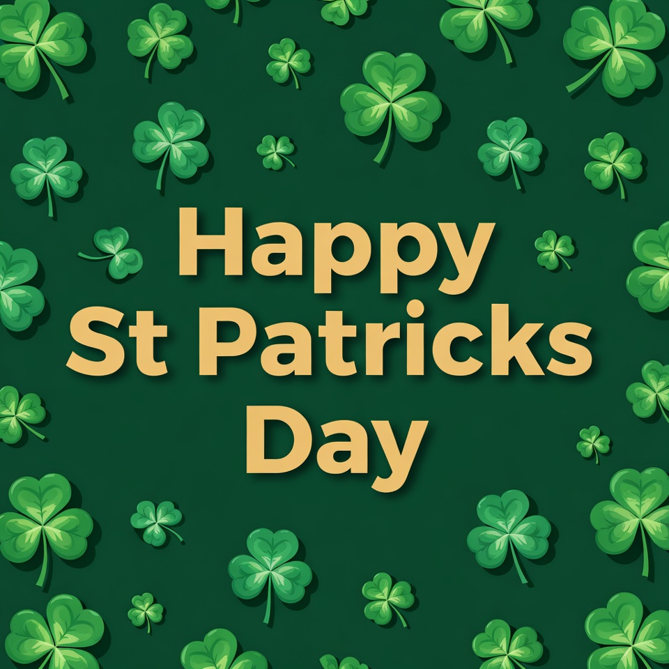 A vibrant green background is covered with scattered four-leaf clovers. Bold gold text reads 'Happy St Patrick's Day' in the center. The design features a festive illustration perfect for holiday greetings.