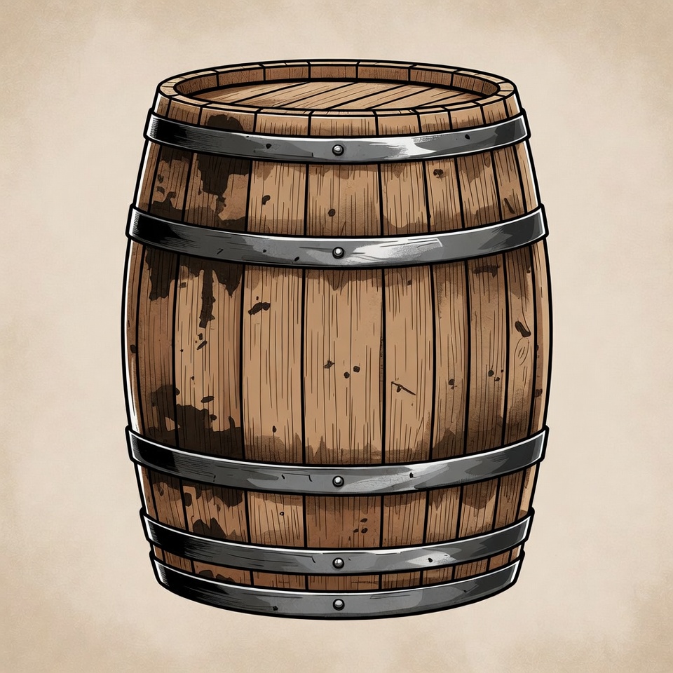 A detailed illustration of a weathered wooden barrel stands upright on a beige background. The barrel features curved wooden staves bound by silver metal hoops and shows stains and dirt marks for a realistic aged appearance. It is depicted in a hand-drawn cartoon style with textured shading.