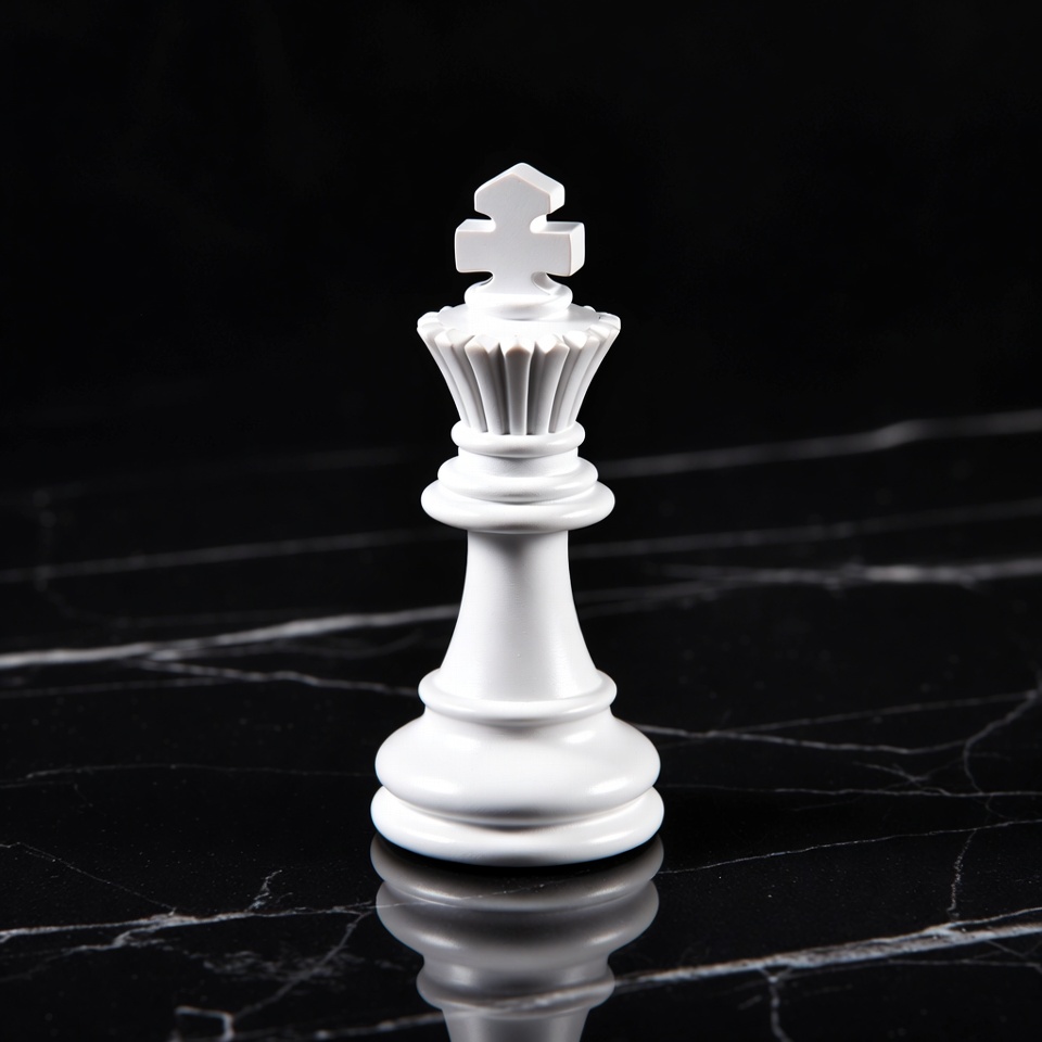A white king chess piece stands on a black marble surface with a subtle reflection below. It features a detailed cross-shaped top, ornate crown, and classic pedestal base. The piece is centered against a dark background.