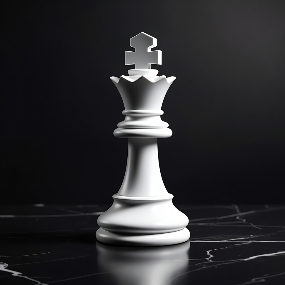3D render, black background, board game, chess game, chess piece, cross top, crown, game piece, glossy, isolated, king piece, marble surface, reflection, shadow, strategy game, white king, chess king