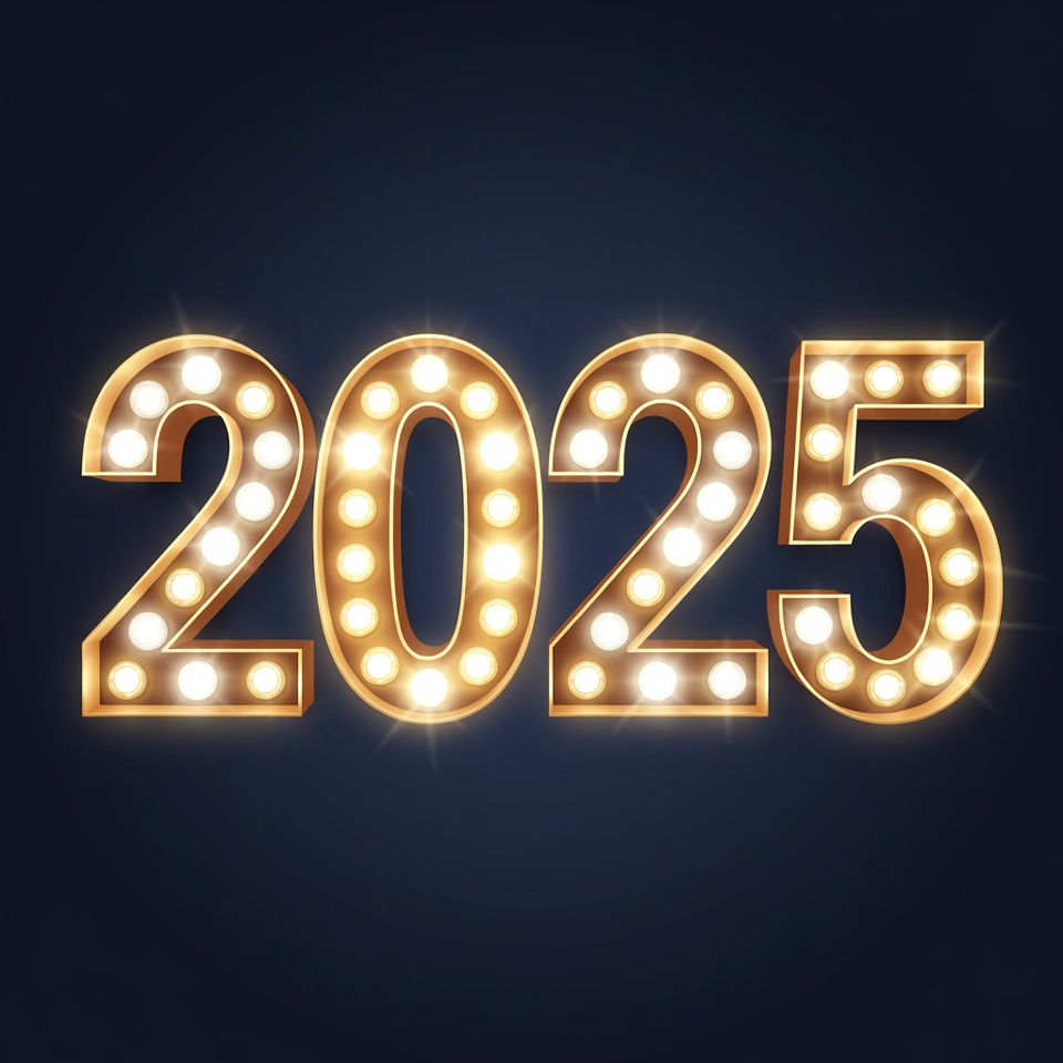 Large golden numbers '2025' with bright bulb lights shine against a dark blue background. The numerals feature a 3D effect with white dots simulating illuminated bulbs. The design is bold and festive, isolated on a solid dark backdrop.