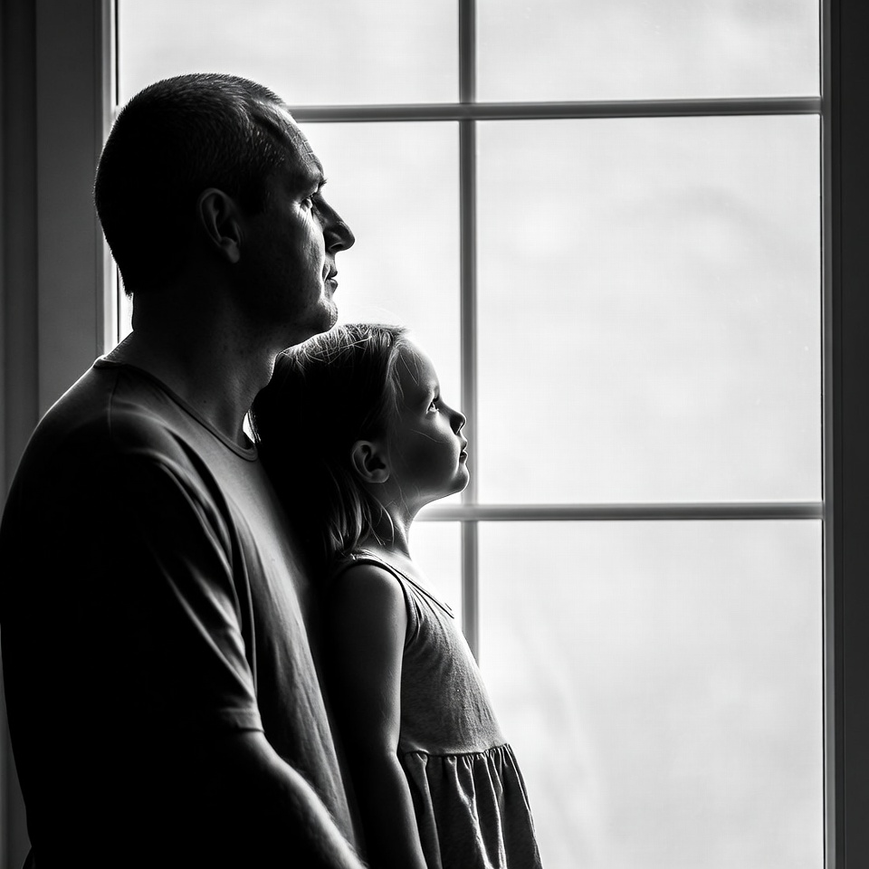 A man and a young girl stand side by side gazing out a large window with multiple panes. The image is in black and white, capturing their profiles with soft lighting. The father has short hair and wears a t-shirt, while the girl has long hair and a sleeveless dress.