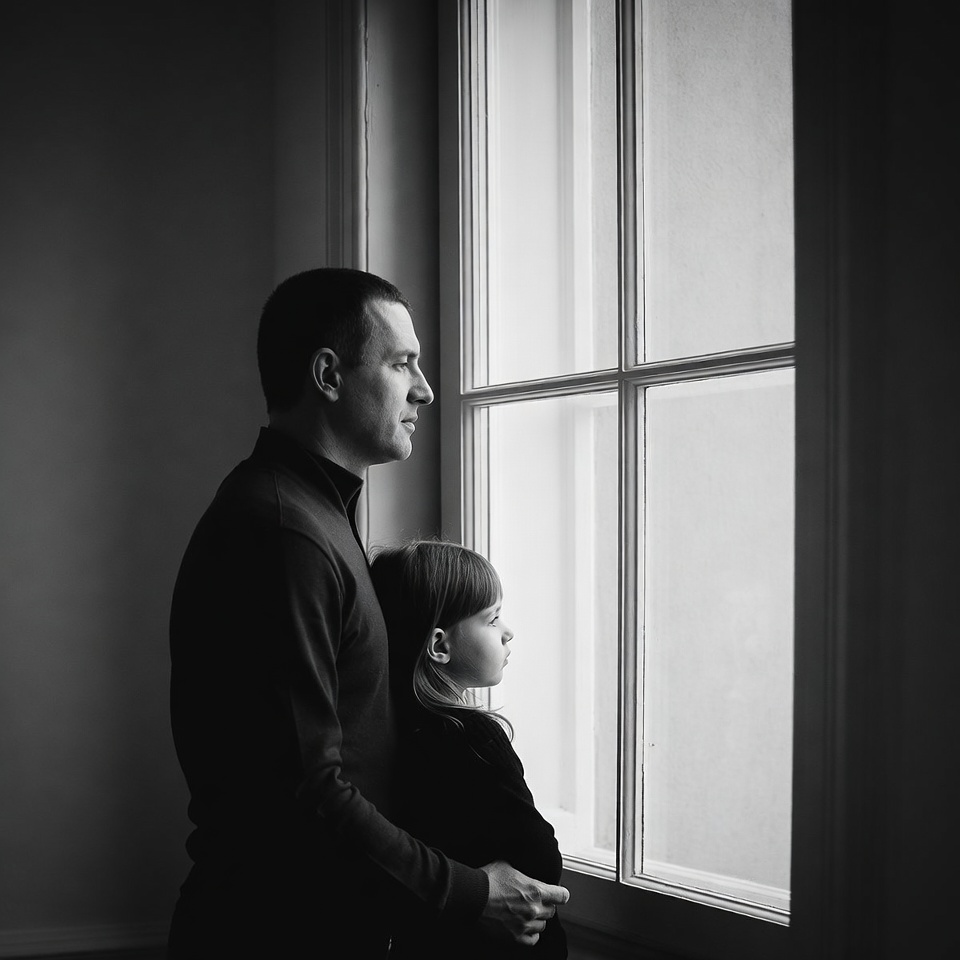 A man stands behind a young girl, both gazing out a large window in a black and white photograph. He has short dark hair and wears a dark shirt, gently placing his hands on her shoulders. She has long hair and wears a dark dress, with soft light illuminating them from the window.
