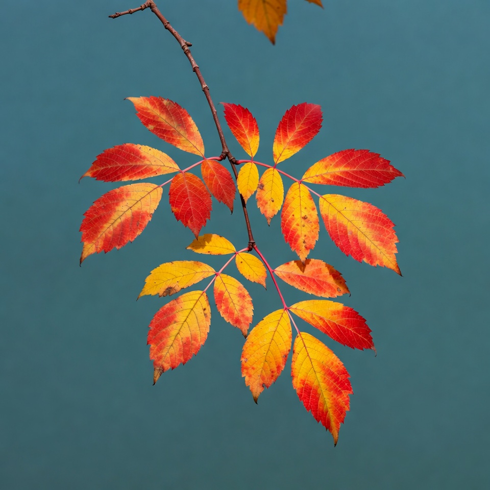 autumn, blue background, branch, fall, fall foliage, foliage, isolated background, leaves, nature, orange leaves, plant, red leaves, seasonal, sumac branch, tree branch, vibrant colors, yellow leaves, autumn leaves