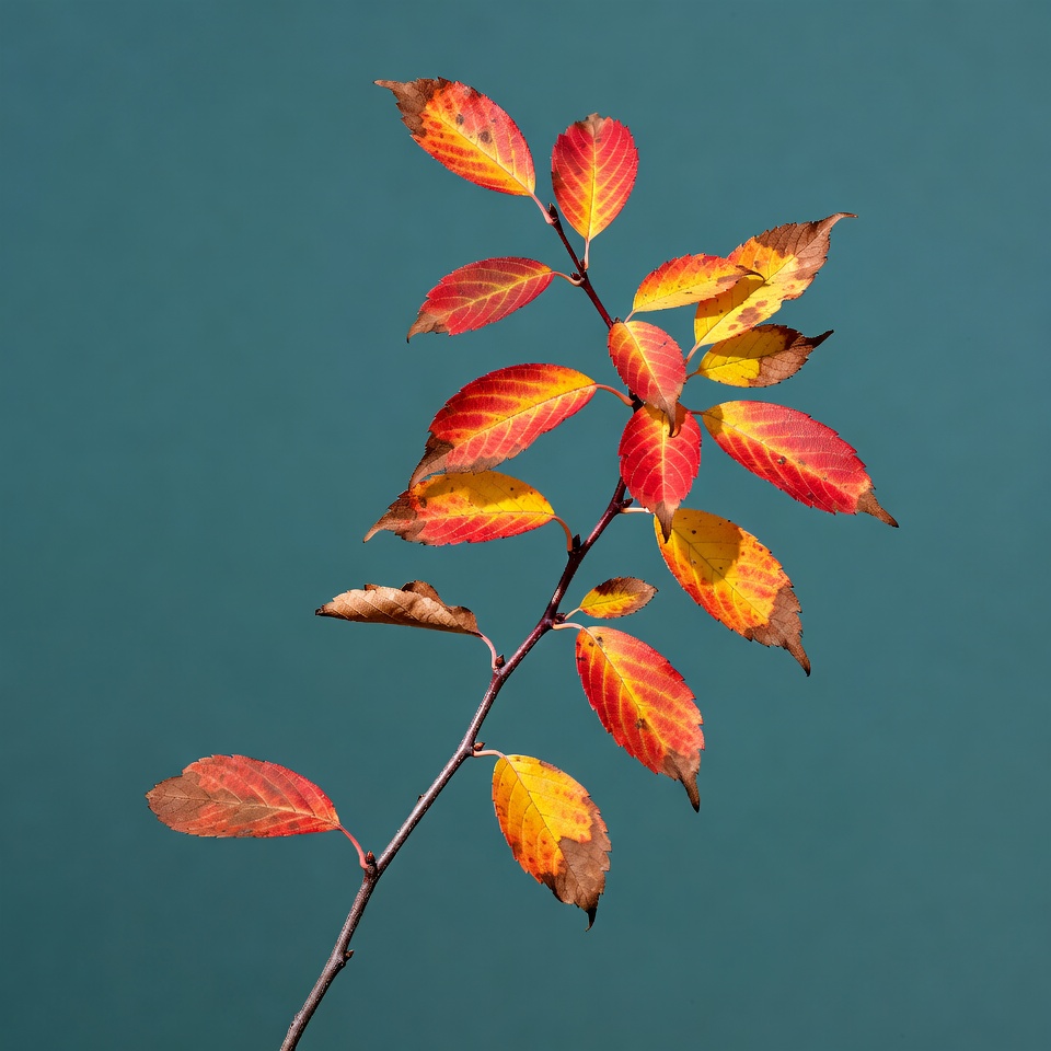 A close-up of a slender branch with multiple autumn leaves displaying vibrant shades of red, orange, and yellow. The leaves show varying degrees of color transition from green to fiery fall hues. The branch is isolated against a solid teal background.