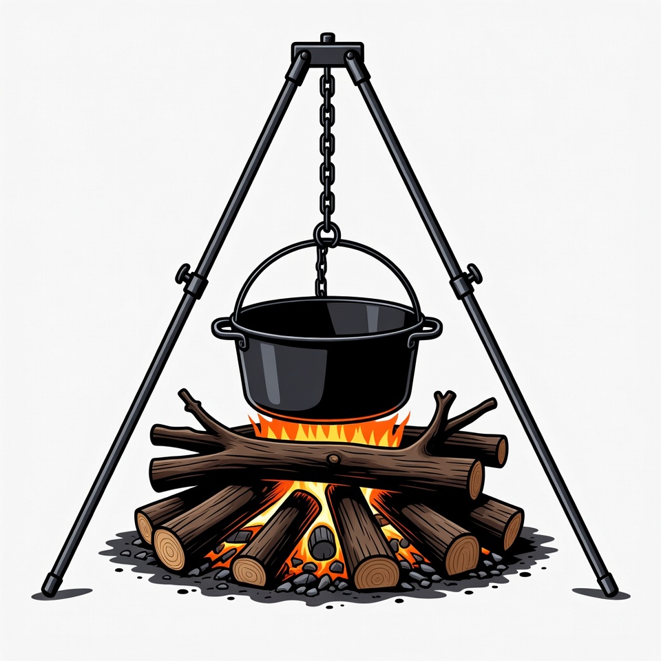 A black pot hangs from chains on a metal tripod over a burning campfire. The fire consists of stacked logs with glowing embers and flames. The illustration is set against an isolated white background.