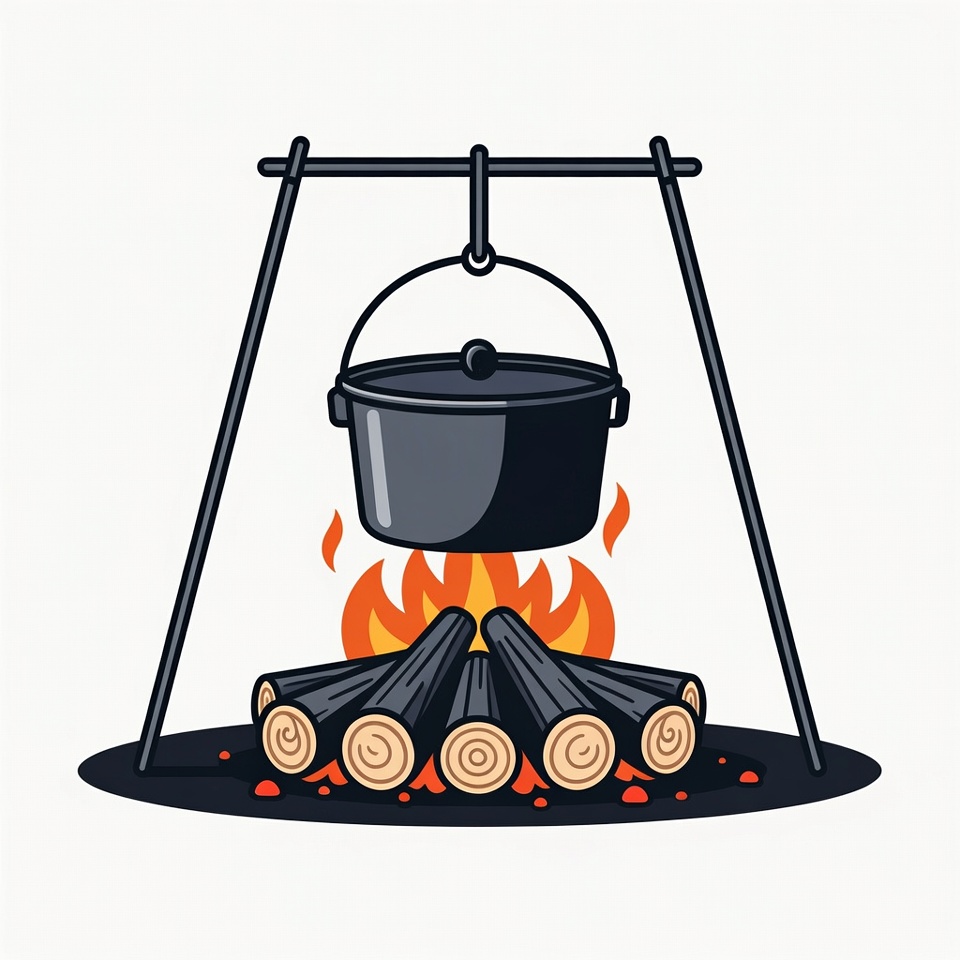 black pot, camp stove, camping, clipart, cooking pot, dutch oven, fire, flames, hanging pot, illustration, isolated background, logs, metal frame, outdoor cooking, pot, tripod, vector, wilderness cooking, wood, campfire