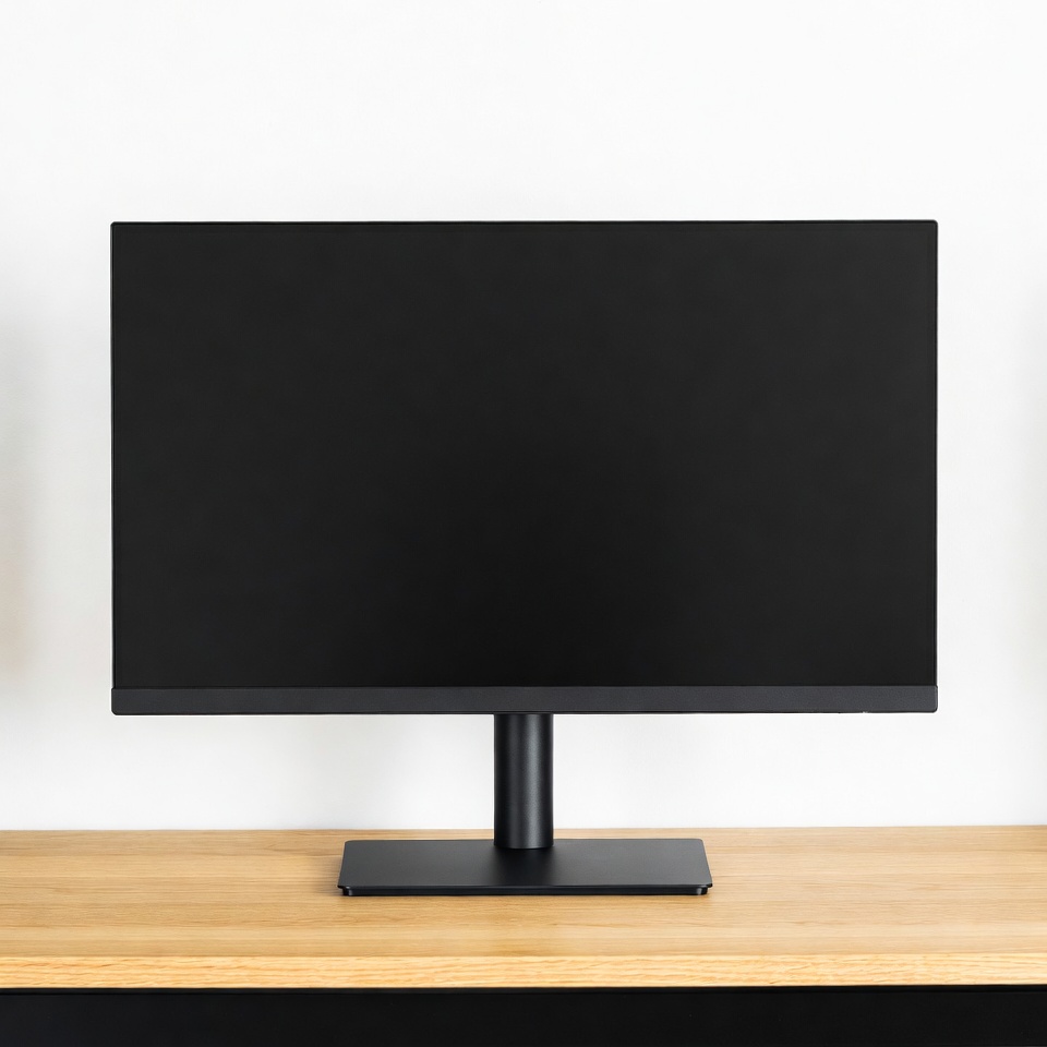 LCD monitor, PC monitor, black monitor, desktop monitor, display screen, flat screen, isolated background, modern monitor, monitor stand, office equipment, thin bezel, white wall, wooden desk, computer monitor