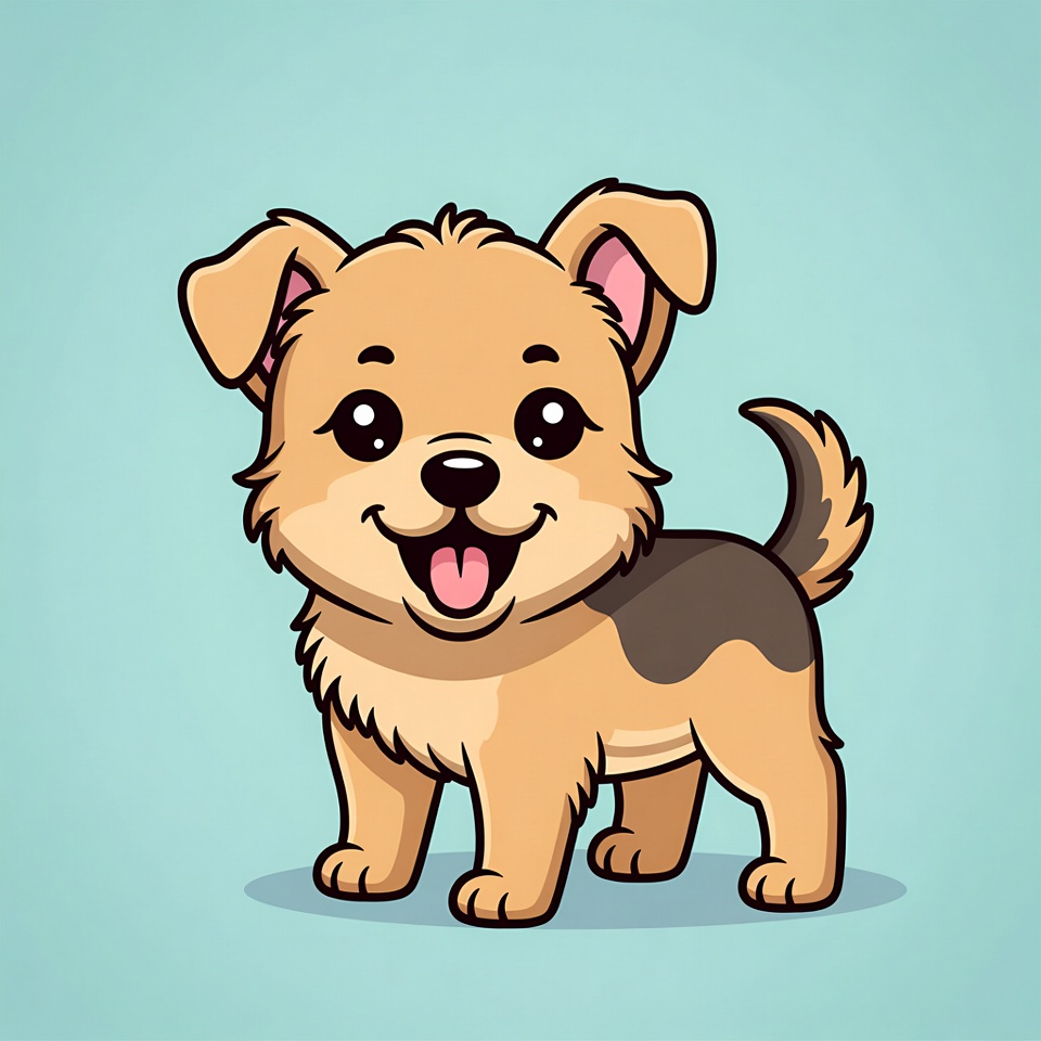 A cute cartoon puppy with tan fur and a darker back stands on a light blue background. The puppy has large expressive eyes, floppy ears, and a happy open-mouthed smile with its tongue out. It is illustrated in a kawaii style with fluffy fur details and a wagging tail.