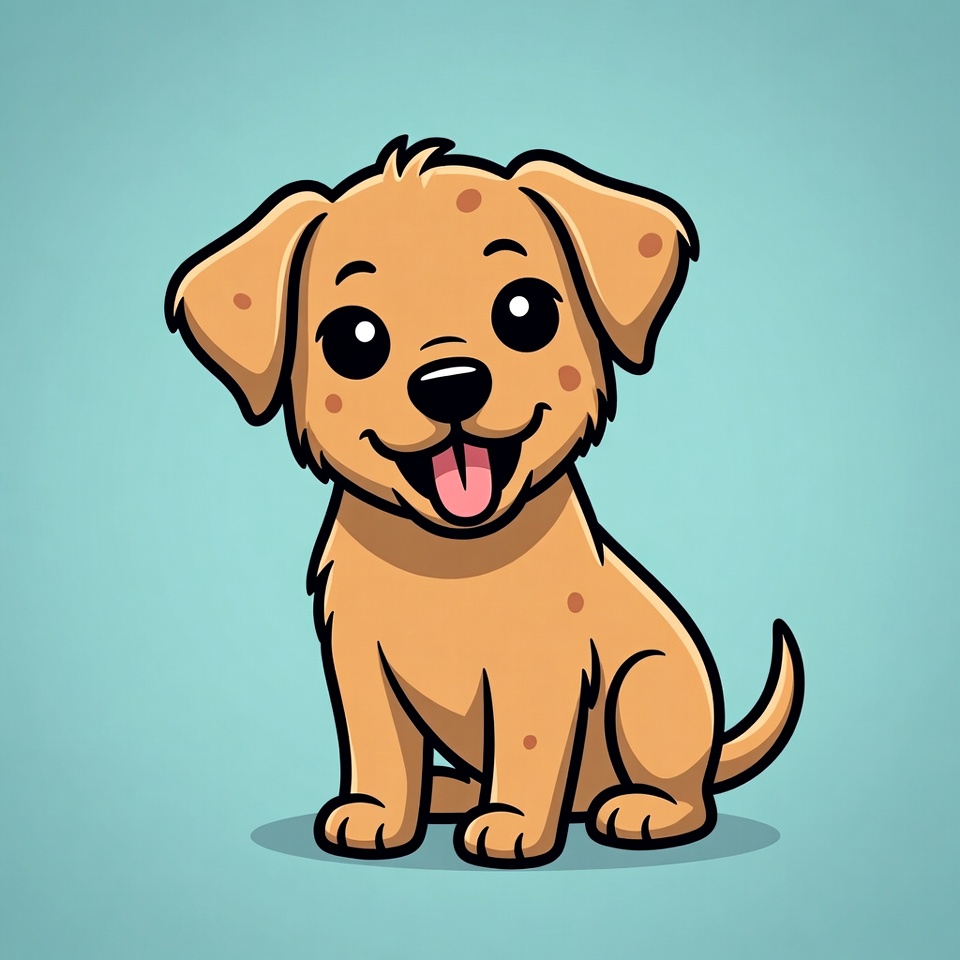 A cute cartoon puppy with tan fur and black spots sits on a light blue background. The puppy has large expressive eyes, a smiling mouth with tongue out, and floppy ears. It is illustrated in a whimsical style with bold outlines.