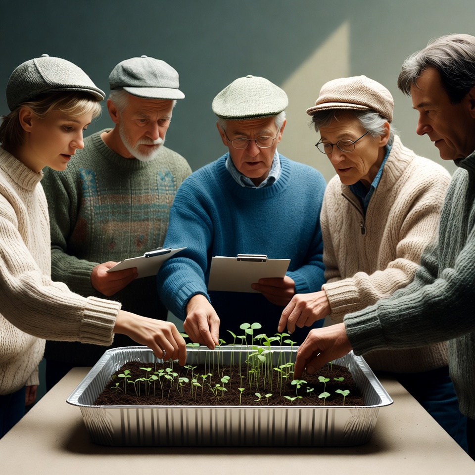 A diverse group of five older adults, including one woman and four men wearing knitted sweaters and flat caps, gathers around a metal tray filled with young green seedlings on a table. They hold clipboards and point at the plants while closely inspecting them. The scene is set against a plain gray background with soft lighting.