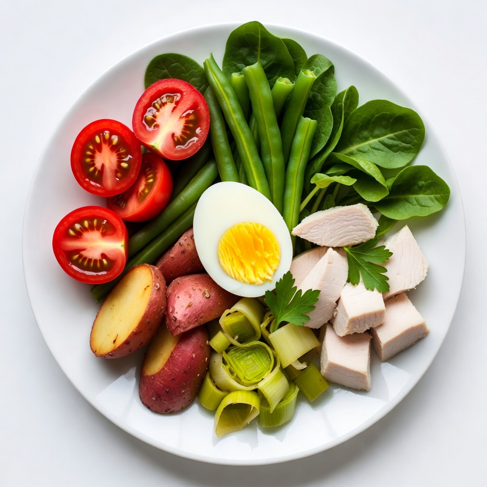 balanced plate, boiled egg, cherry tomatoes, chicken breast, chicken salad, clean eating, diet food, fitness meal, food photography, fresh vegetables, green beans, keto diet, leeks, low carb, meal prep, nutritious meal, organic veggies, overhead shot, plate food, potatoes, protein salad, salad bowl, spinach, superfood salad, top view, veggie salad, white plate, whole foods, healthy salad