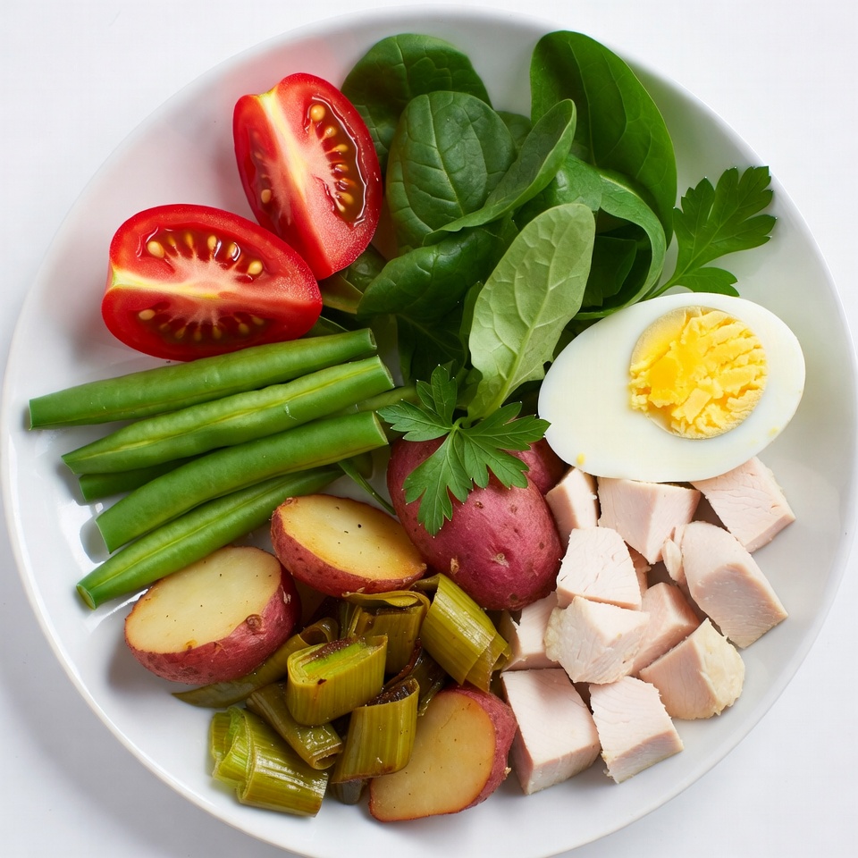 A white plate holds a colorful healthy salad featuring sliced boiled egg, chunks of chicken breast, halved cherry tomatoes, green beans, spinach leaves, parsley, and roasted red potatoes. The ingredients are artfully arranged in sections for visual appeal. Fresh green onions add extra texture to the vibrant dish.