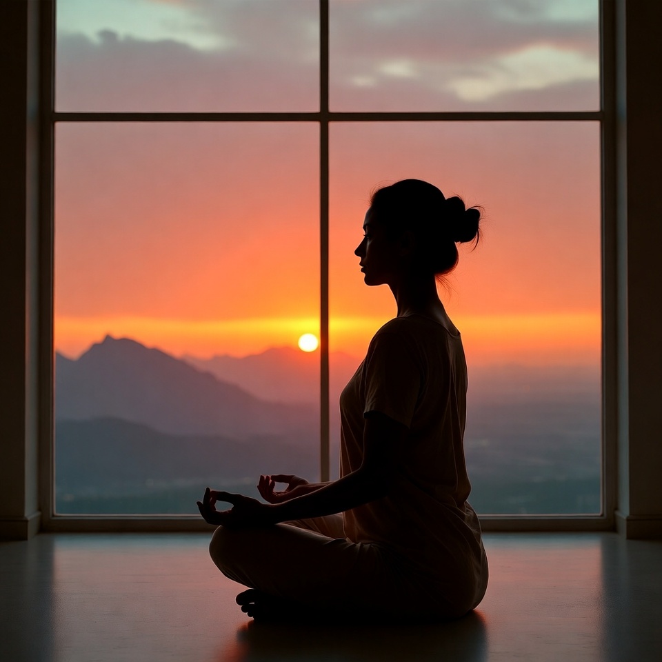 A silhouette of a woman with hair in a bun sits cross-legged in lotus pose, meditating in front of a large window. She wears a loose top and faces a vibrant orange sunset over distant mountains. The scene features a peaceful indoor floor with an expansive view of the horizon.