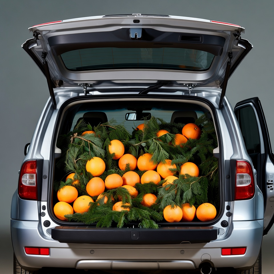 Christmas, automobile, cargo area, evergreen branches, fir branches, fresh oranges, fruit, greenery, holiday, isolated background, open trunk, oranges, produce, silver SUV, stacked oranges, vehicle, car trunk