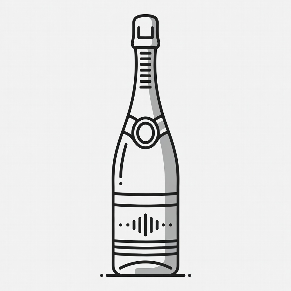 alcohol, beverage, bottle, celebration, champagne, clipart, cork, elegant, foil, graphic, illustration, isolated background, label, line art, luxury, minimalist, sound waves, sparkling wine, vector, white background, champagne bottle