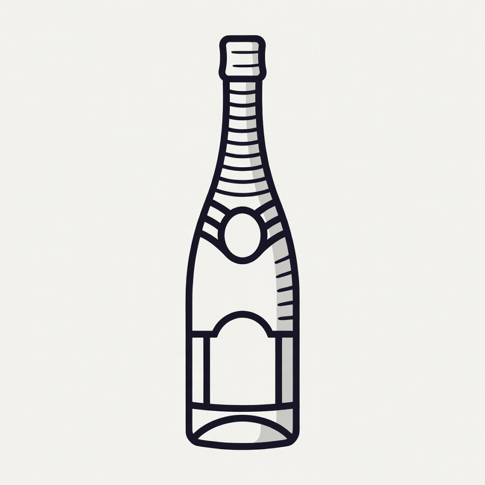 alcohol, beverage, bottle, champagne, clipart, cork, drawing, graphic, illustration, isolated background, label, line art, minimalist, outline, shaded, simple, sparkling wine, vector, wine bottle, champagne bottle