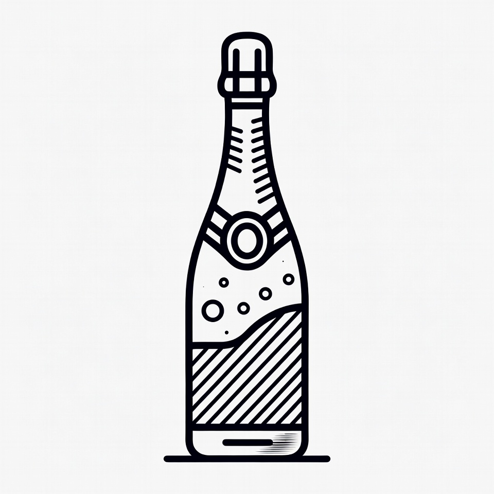 alcohol, black white, bottle, bubbles, celebration, champagne, clipart, cork, drink, festive, icon, illustration, isolated background, label, line art, outline drawing, sparkling wine, striped, vector, champagne bottle