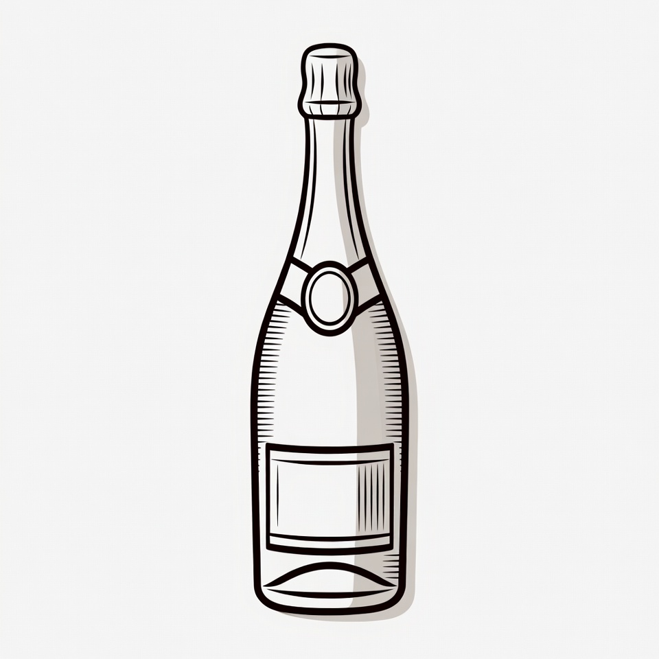 A detailed line art illustration of a tall champagne bottle stands upright on a white background. The bottle features a cork, foil neck label, and textured glass shading. It has a blank rectangular label on the front.