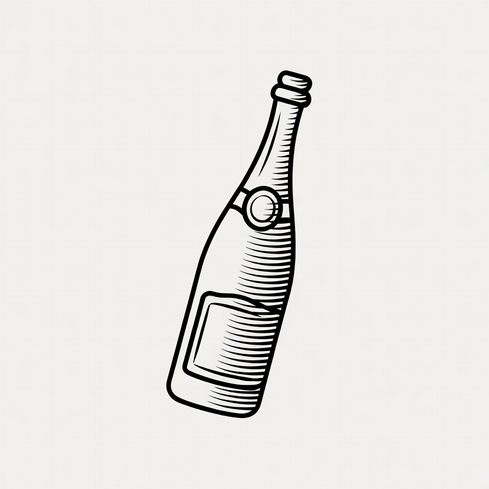 alcohol, beverage, black and white, bottle, celebration, champagne, clipart, cork, drawing, elegant, foil, illustration, isolated background, label, line art, luxury, sketch, vector, vintage style, champagne bottle