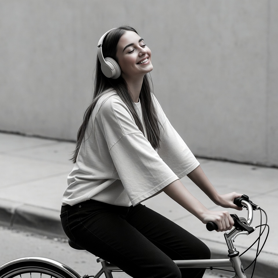 A young woman with long dark hair smiles happily while riding a bicycle on a street. She wears white over-ear headphones, a loose white t-shirt, and black jeans. The image is in black and white against a gray urban background.