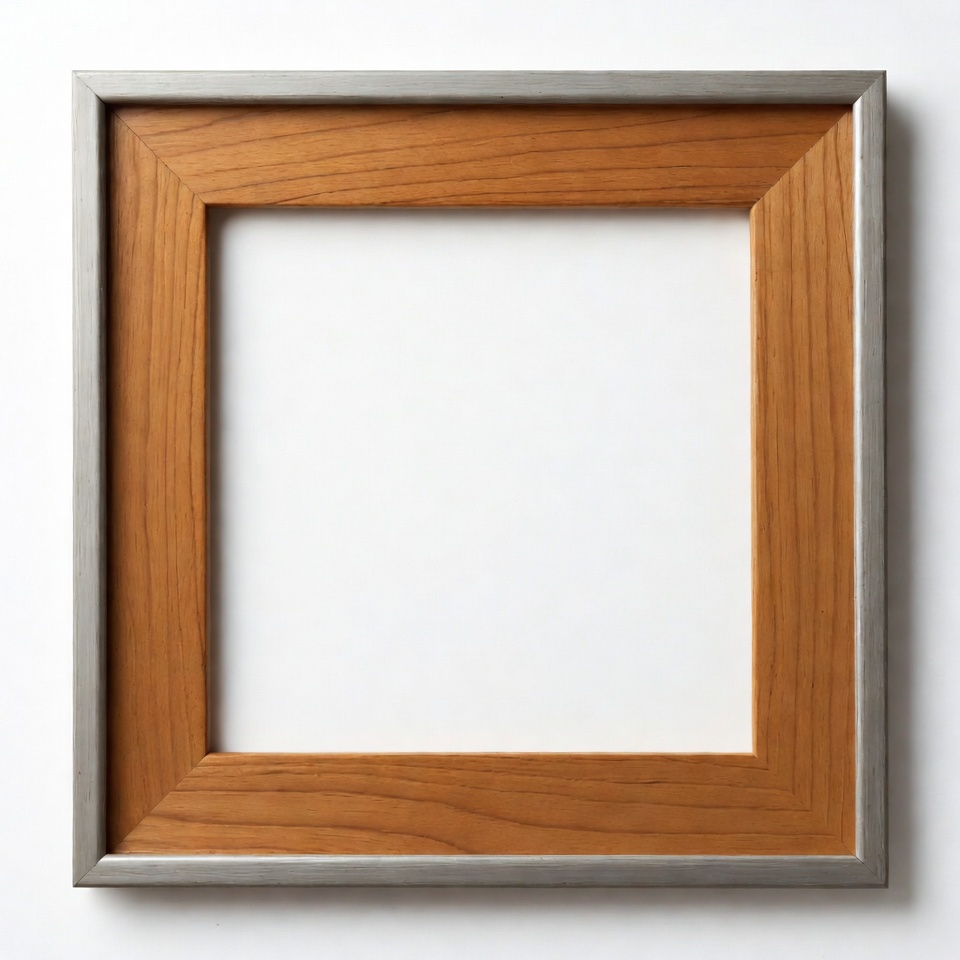 A square picture frame features a warm wooden inner border made of cherry wood with visible grain. It is surrounded by a sleek silver metal outer frame. The frame is centered on a plain white background with an empty white space inside.