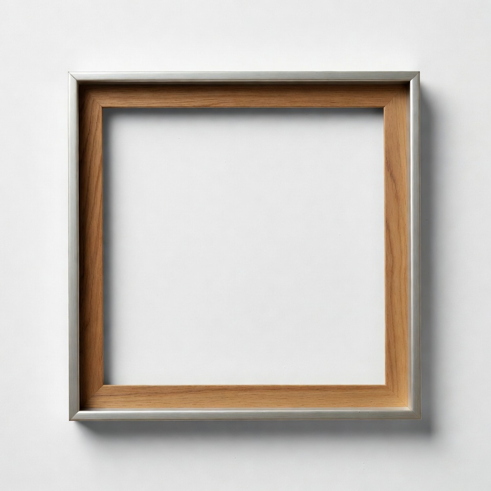A rectangular picture frame features a light wood inner border and a shiny silver outer edge. The frame hangs on a plain white wall with an empty white space inside. It is centered and viewed straight on.