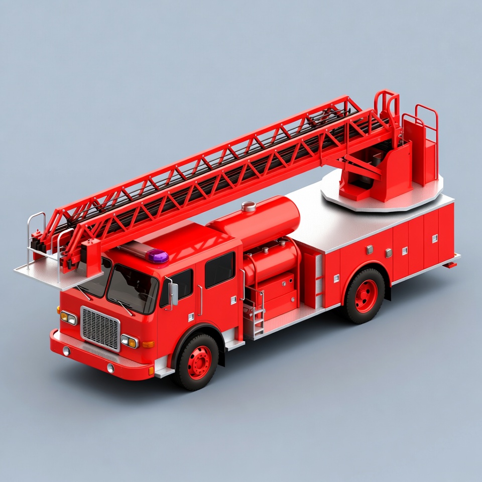 3D model, emergency vehicle, extended ladder, fire engine, firefighter truck, gray background, isolated, ladder truck, red fire truck, render, rescue vehicle, siren lights, truck cab, wheels, fire truck