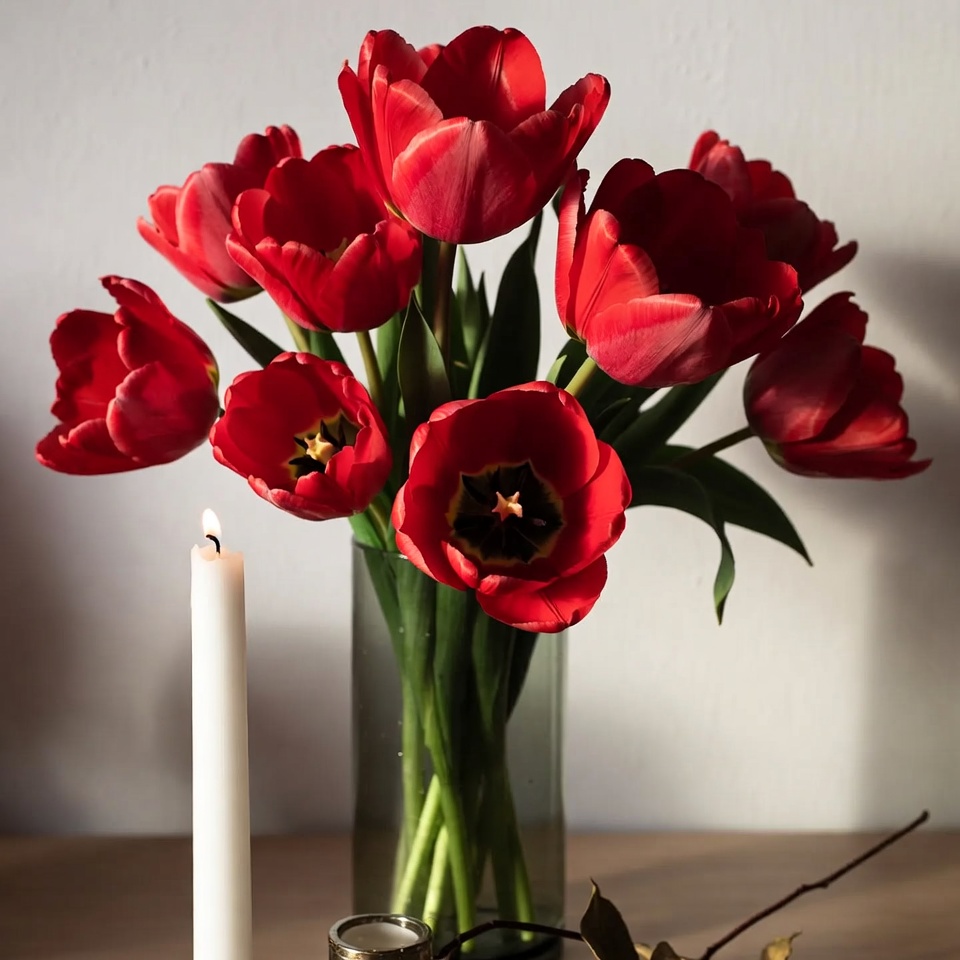 A bouquet of vibrant red tulips stands in a clear glass vase on a wooden surface. A white lit candle is positioned beside the vase, casting a soft glow. Green stems and a few small branches complete the simple arrangement against a white background.