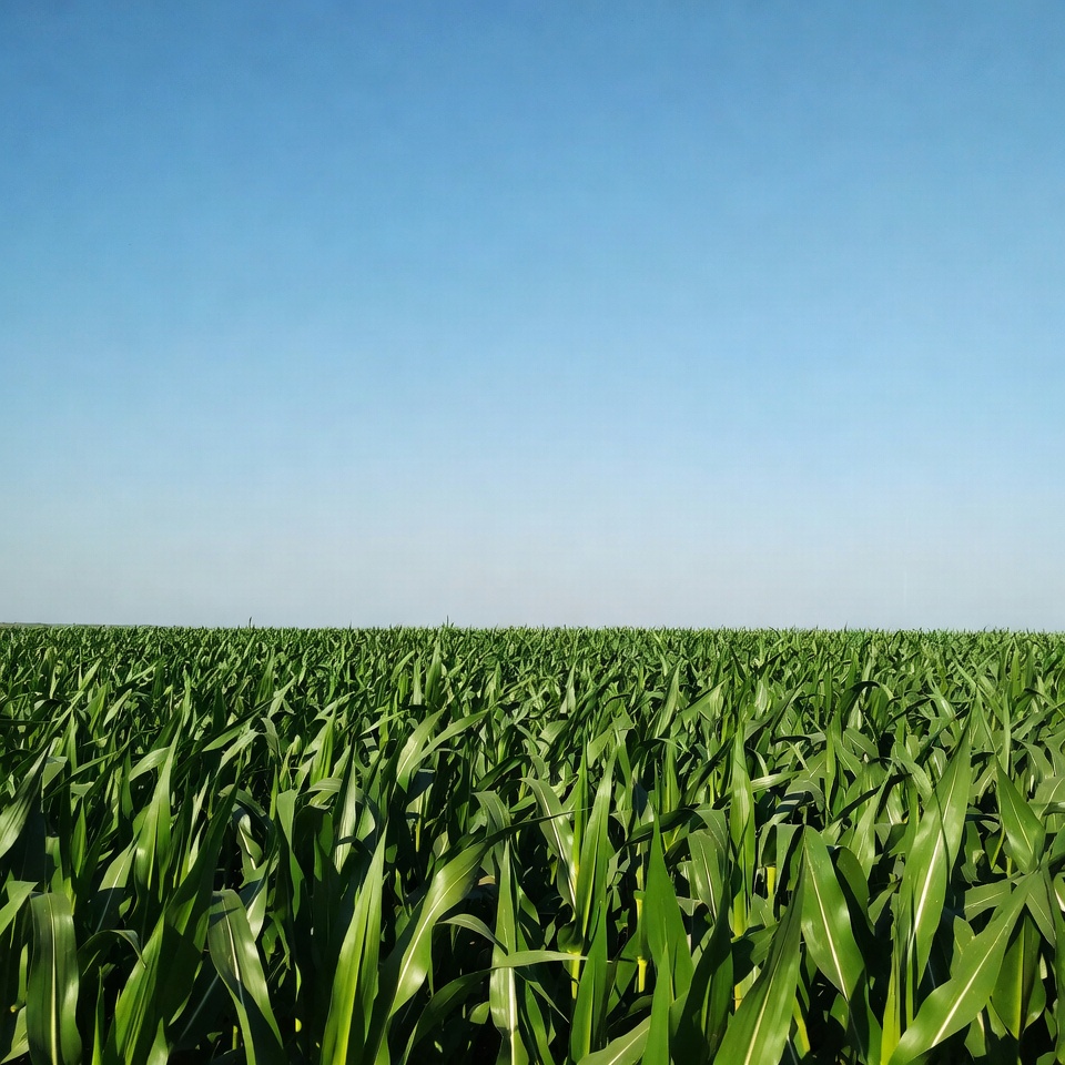 A vast field of tall green corn plants stretches to the horizon under a clear blue sky. The corn leaves sway gently, showcasing vibrant green hues. The scene captures a wide agricultural landscape with no people or structures visible.