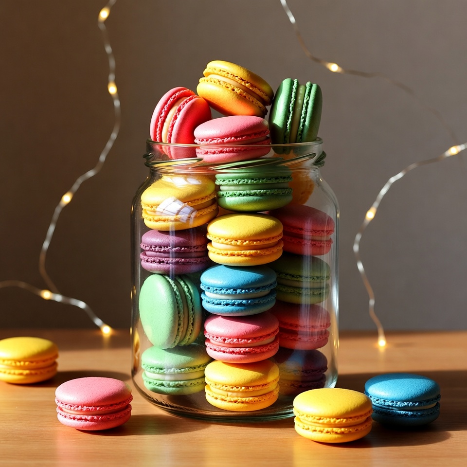 A glass jar filled with stacked colorful macarons in shades of pink, yellow, green, blue, purple, and teal sits on a wooden table. Twinkling string lights hang in the blurred background, adding a festive glow. A few macarons are scattered around the base of the jar.