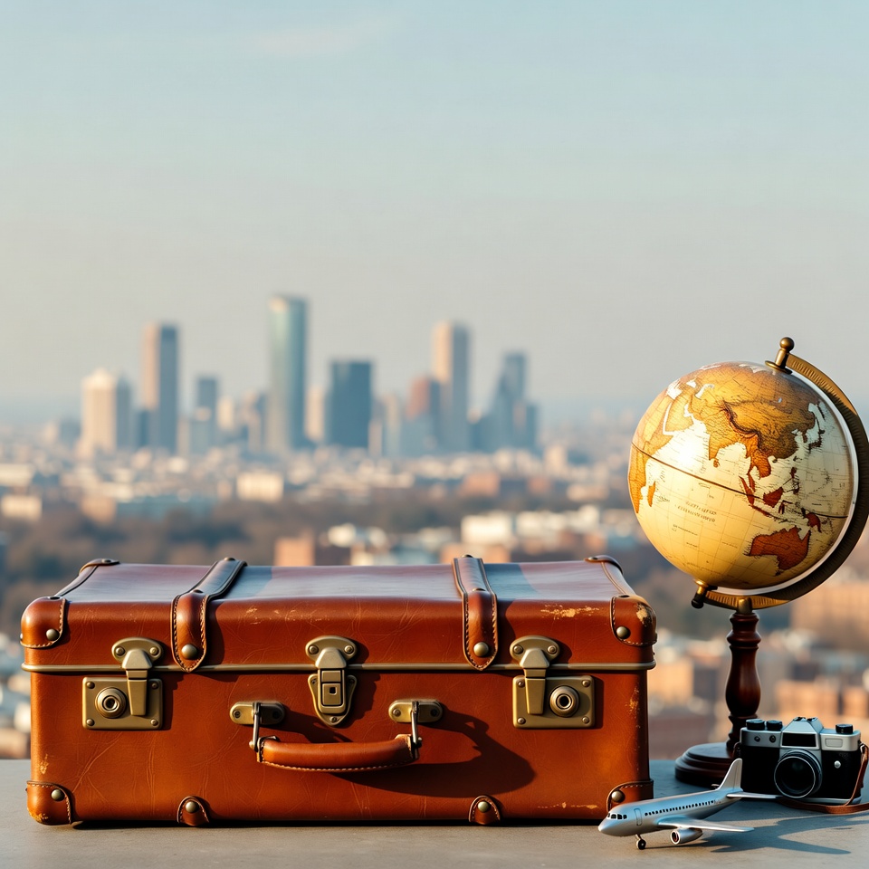 A brown vintage suitcase sits open on a surface with a small airplane model and retro camera nearby. A detailed globe stands beside it, showing continents and oceans. A blurred city skyline with tall buildings appears in the background under a hazy sky.
