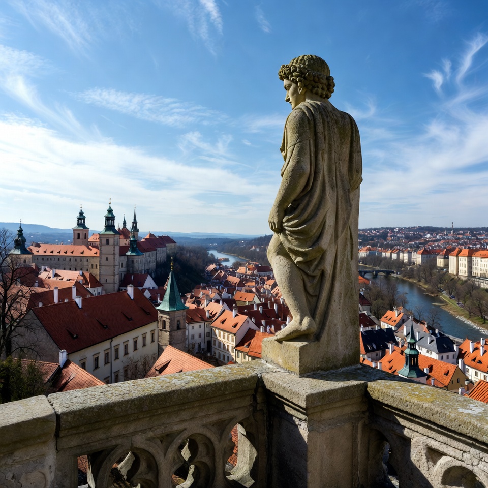 A stone statue of a robed male figure with curly hair stands on a balcony edge. It gazes over the terracotta rooftops of Prague's historic buildings, including towers and a winding river below. The scene features a clear blue sky with scattered clouds.