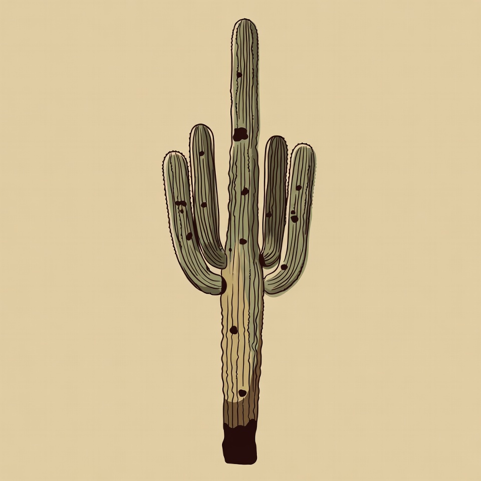 A hand-drawn illustration of a tall saguaro cactus with multiple arms stands centered on a plain beige background. The cactus features textured green skin with dark spots and subtle shading for depth. It is depicted in a simple, isolated style typical of clipart.