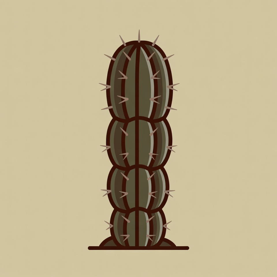 A simple line-drawn illustration of a tall cylindrical cactus with multiple segments and sharp spines covers the plant. It stands on a beige background with a subtle shadow beneath. The artwork uses brown and tan tones for a flat, vector style.