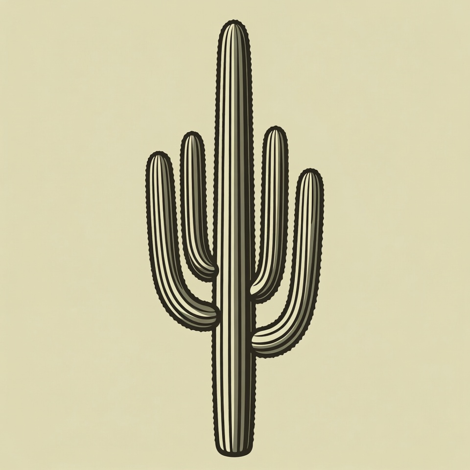 A simple line art illustration of a tall saguaro cactus with multiple arms stands on a plain beige background. The cactus features detailed spines and a sturdy, upright structure. It is depicted in a minimalist vector style with subtle shading.