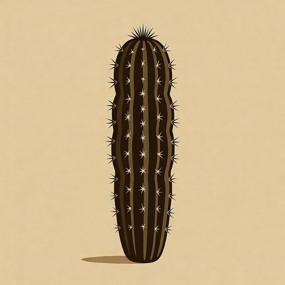 A simple vector illustration of a tall, cylindrical cactus with numerous sharp spines covers the image. It stands upright on a beige background with a subtle drop shadow beneath it. The cactus has a textured, ribbed surface in shades of brown.