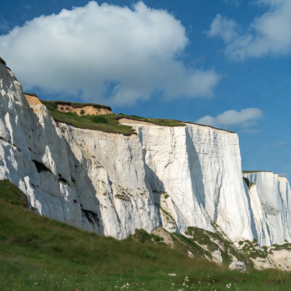 Dover cliffs, England, Europe, United Kingdom, beach cliffs, blue sky, chalk cliffs, cliffs, coast, coastal landscape, geology, grass field, green grass, landscape, nature, outdoor scenery, rock formations, seaside, sunny day, white clouds, white cliffs