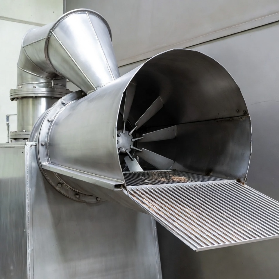 A large stainless steel industrial fan with multiple blades is mounted on a metallic machine in a factory setting. A grated metal tray extends from the machine, containing some scattered debris. Silver ducts and pipes connect to the fan housing against a reflective metal wall.