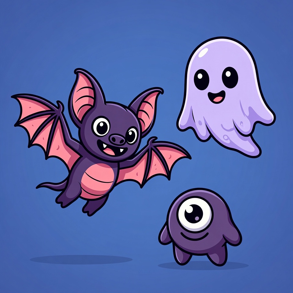 A vibrant cartoon illustration features a purple bat with large wings and a smiling face flying on a blue background. Next to it stands a translucent white ghost with big eyes and a cheerful grin. A small purple one-eyed monster completes the spooky yet cute trio, all in a flat clipart style.