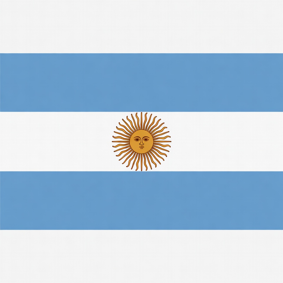 The flag of Argentina features three horizontal stripes in light blue, white, and light blue. A golden Sun of May with a face and radiating rays is centered on the white stripe. The design is simple and bold against a plain background.
