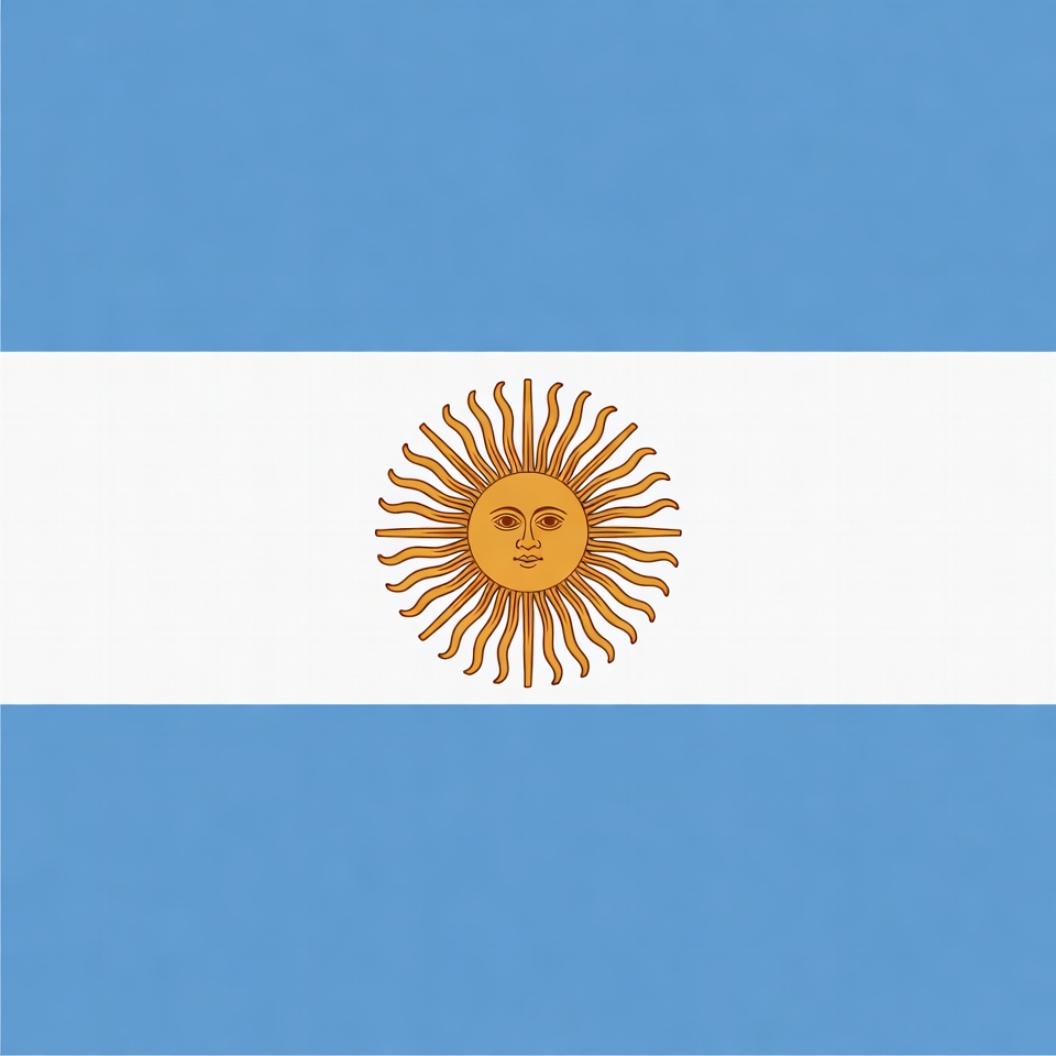 The flag of Argentina features three horizontal stripes of light blue and white. A golden Sun of May with a human-like face and radiating rays is centered on the white stripe. The design is simple and bold against a solid background.
